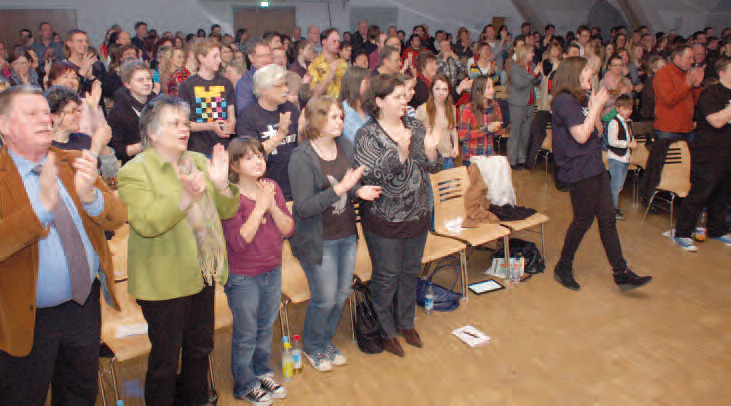 Vor einigen Wochen hatten die Sänger, Schauspieler und Tänzer des Adonia-Musicals „Das Urteil" Text und Musik-CD zum Üben bekommen. In der zweiten Osterferien-Woche wurde schließlich unter Hochdruck im Gemeindesaal geprobt. Neben den 33 Darstellern und sechs Bandmitgliedern im Alter zwischen elf und 19 Jahren waren hinter den Kulissen Techniker, Bühnenbildern, Requisiteure, Maskenbildern, Catering-Team und viele helfenden Hände mit großem Enthusiasmus bei der Sache. Und Pfarrer Bachmann äußerte sich „mächtig stolz" auf diese beeindruckende Teamleistung.